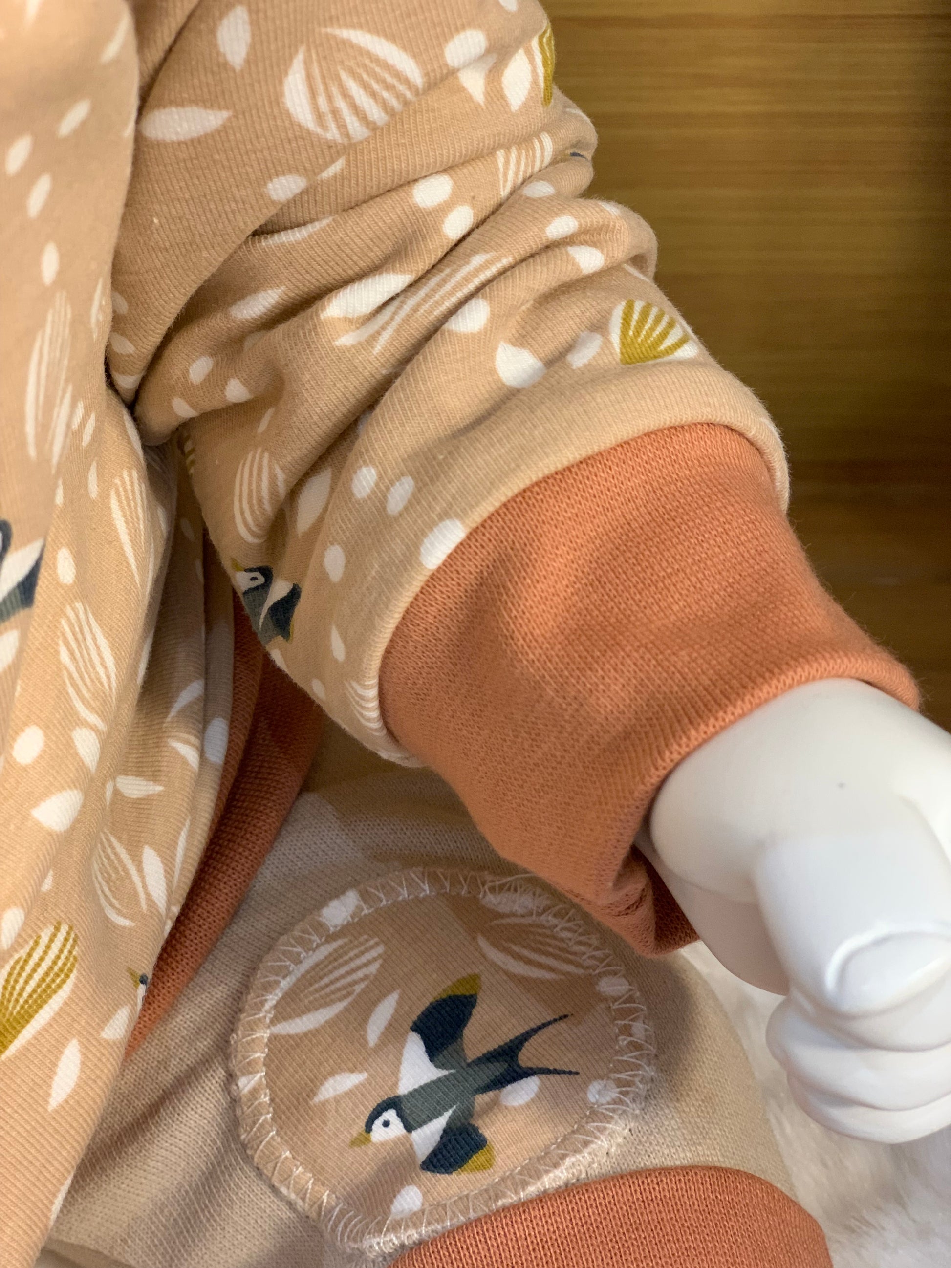 Les motifs petits oiseaux sur fond rose poudré sont associés à une bordure de teinte terracotta. Tissu envers étoilé sur fond blanc.