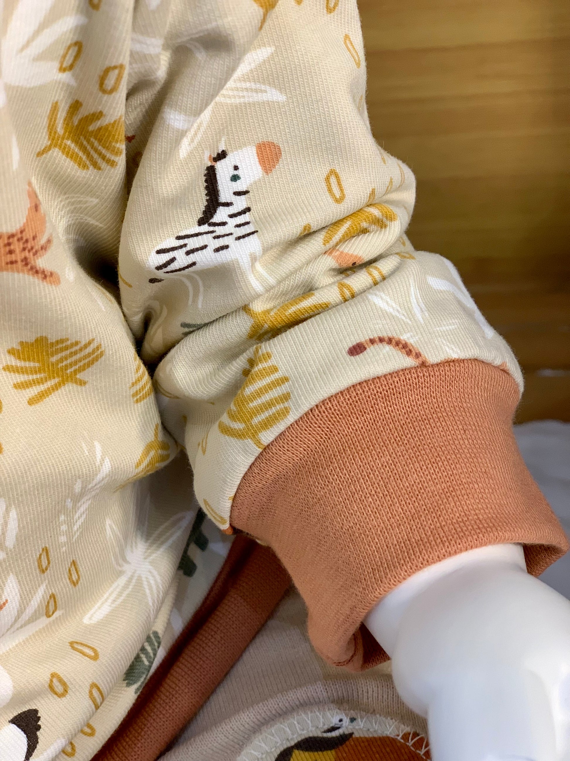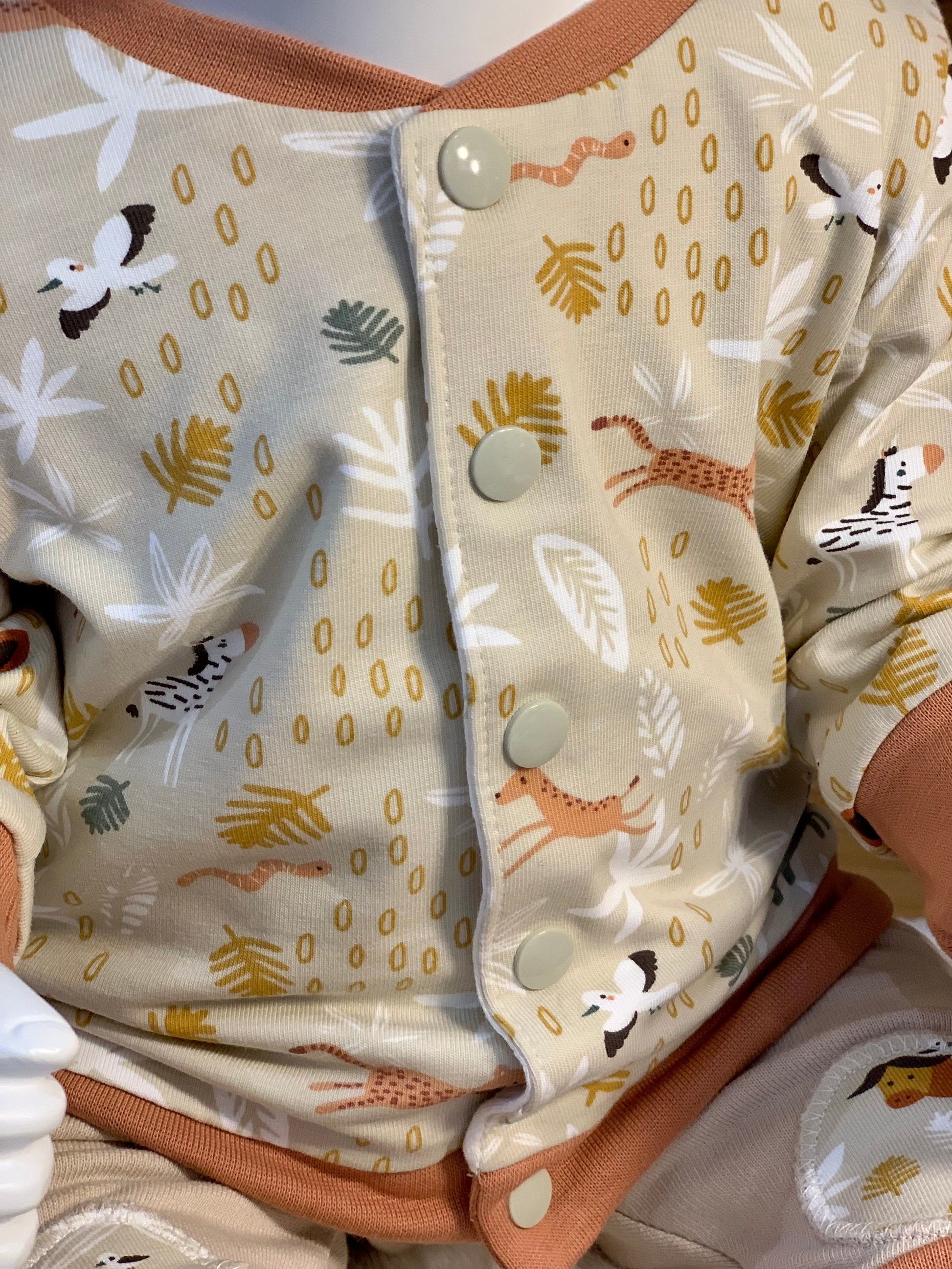 Les motifs animaux de la savane sur fond beige sont associés à une bordure de teinte eucalyptus. Tissu envers étoilé sur fond blanc.